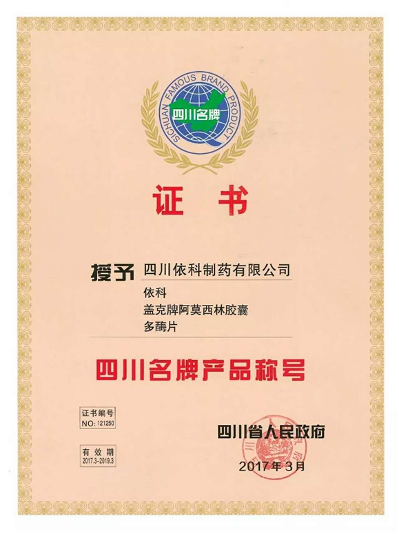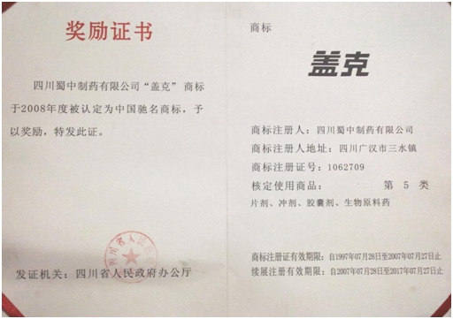 公司高度重视品牌战略,依法注册了“盖克”、“蜀中”、“三星堆”、“阿莫锋”、“益善源”、“蓉通”、“后宫露营”等108件注册商标,1999年“盖克”、2003年“蜀中”、2007年“三星堆”被认定为德阳市知名商标,2001年“盖克”、2004年“蜀中”被认定为四川省著名商标, 2008年“盖克”商标被国家工商行政管理总局认定为“中国驰名商标”。2017年3月,公司盖克牌、后宫露营牌阿莫西林胶囊和多酶片被四川省人民政府授予四川名牌产品称号。2016年,公司实现营业收入66373万元,利税7600万元;2017年,公司实现营业收入75045万元,利税7572万元。公司2017年被命名为德阳市第七批院士专家工作站,2016-2018连续三年被德阳市人民政府确定为重点龙头企业。